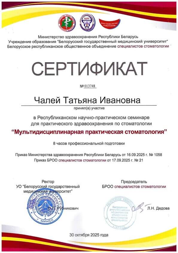 Хочу выразить огромную благодарность лучшему стоматологу Чалей Татьяне Ивановне за успешное решение моих нелёгких проблем с зубами.