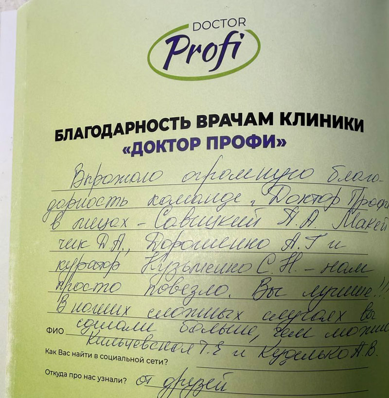 Выражаю огромную благодарность команде «Доктор ПРОФИ» в лицах Савицкий П.В., Макейчик Д.А., Дорошенко А.Г. и куратор Кузьменко С.Н. - нам просто повезло. Вы лучшие!!! В наших сложных случаях вы сделали больше, чем можно.