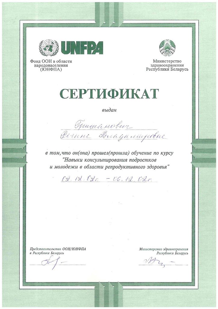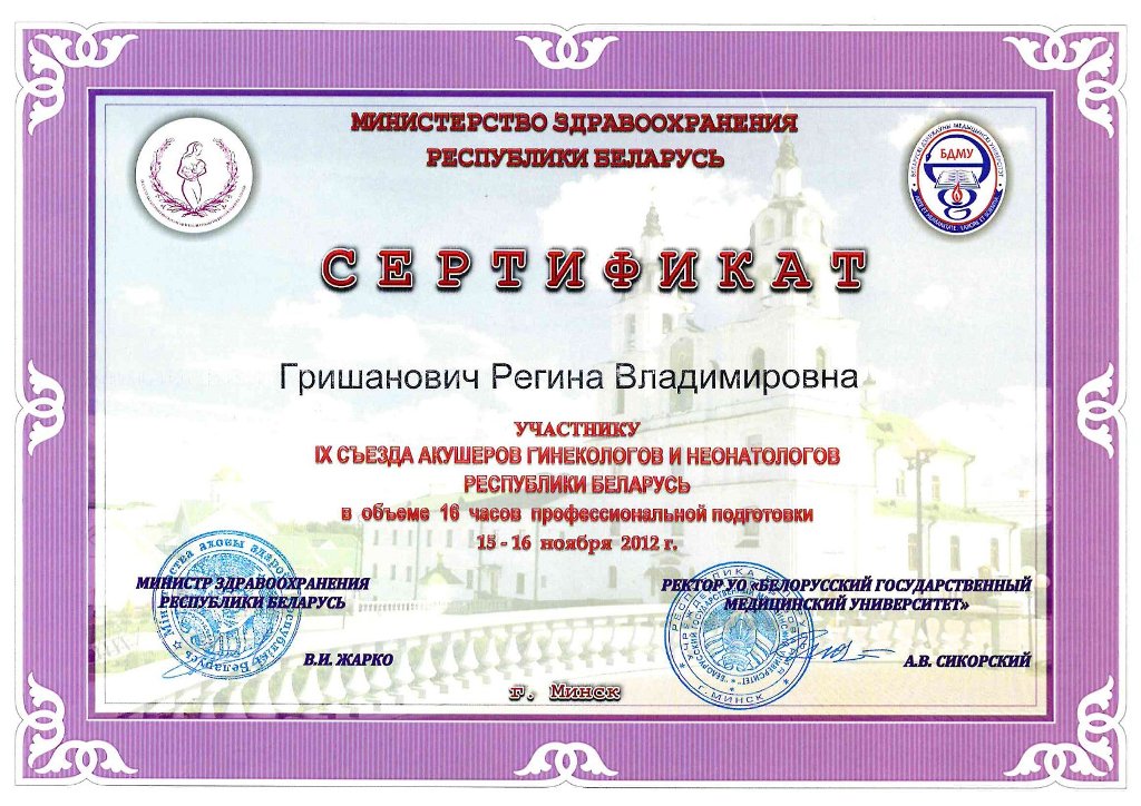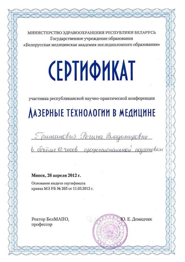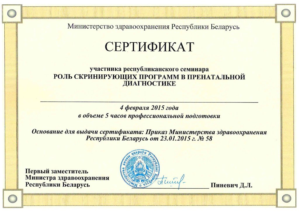 В 2015 году переподготовка по Ультразвуковой диагностике в Государственном учреждении образования «Белорусская медицинская академия последипломного образования» присвоена квалификация врач ультразвуковой диагностики.