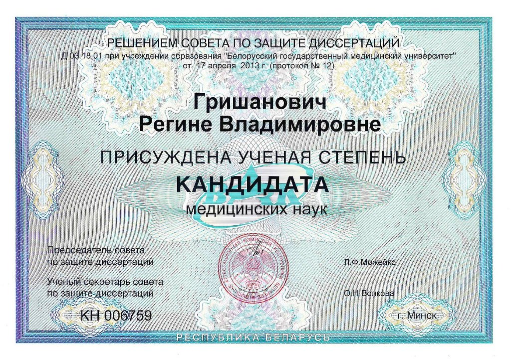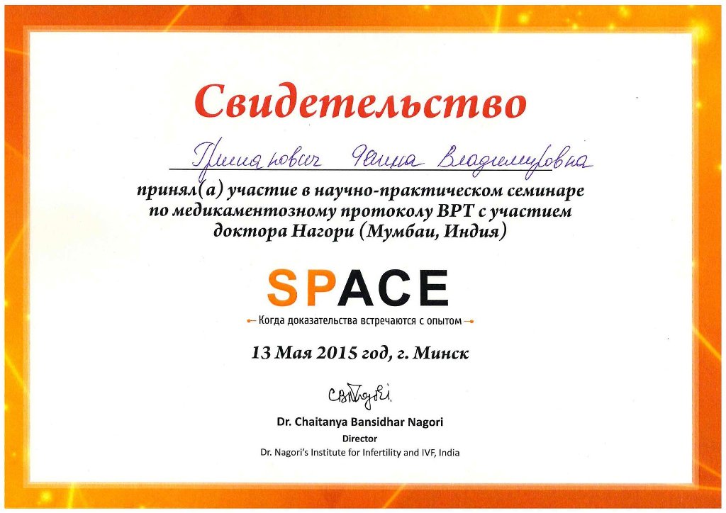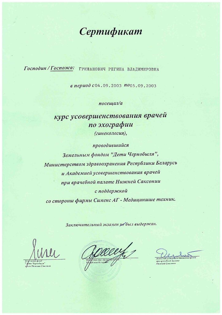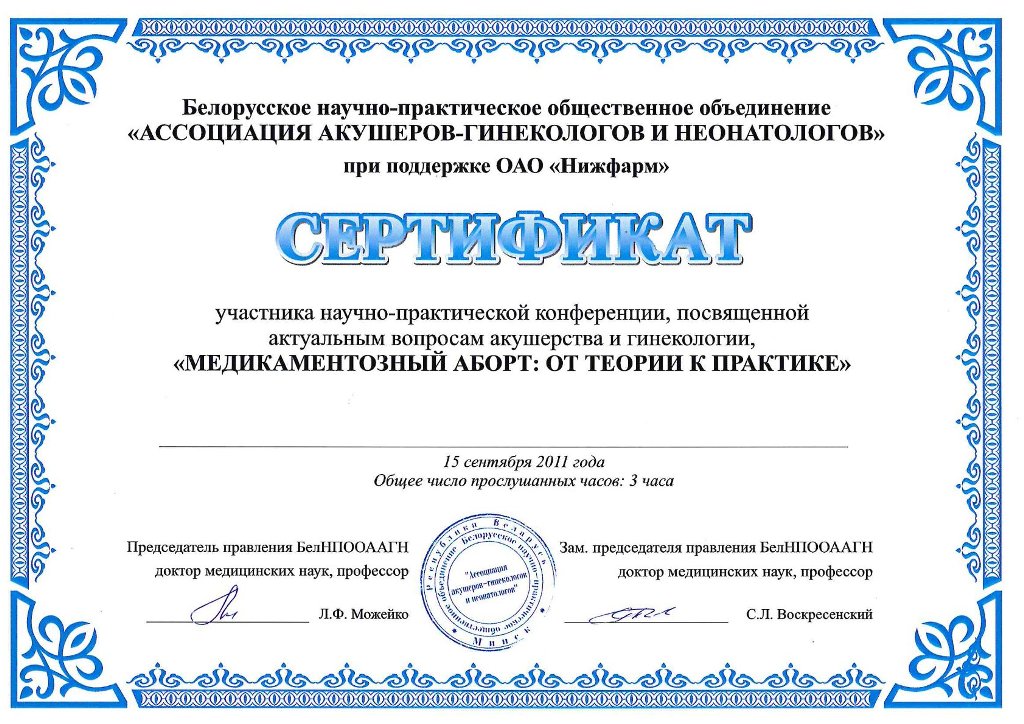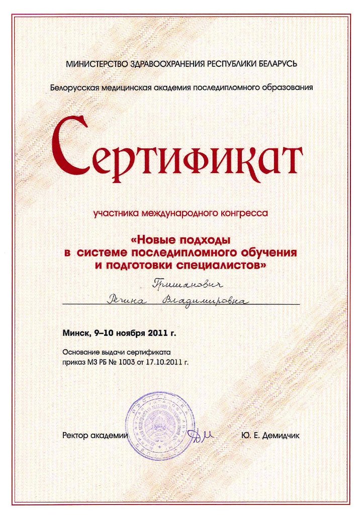 В 2015 году переподготовка по Ультразвуковой диагностике в Государственном учреждении образования «Белорусская медицинская академия последипломного образования» присвоена квалификация врач ультразвуковой диагностики.