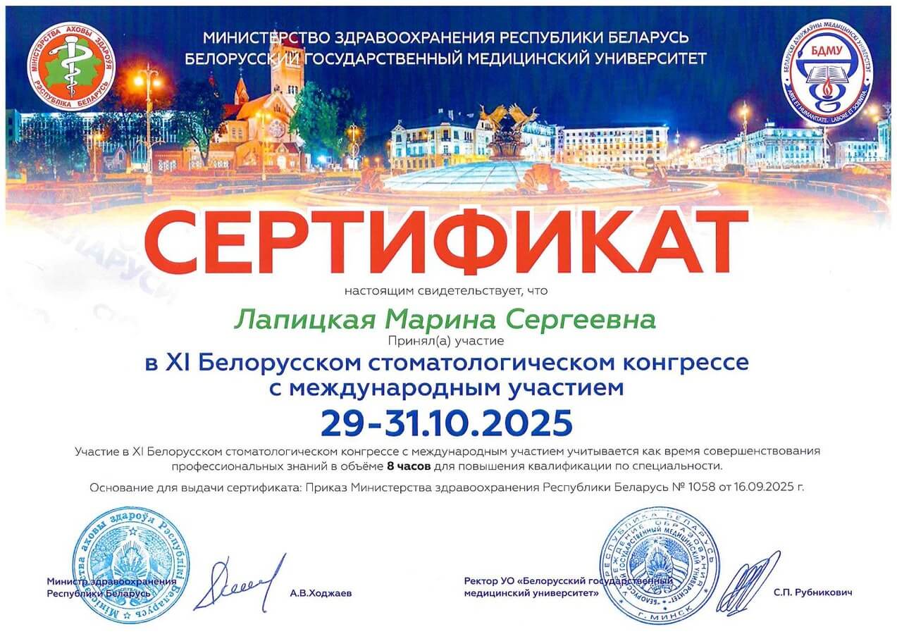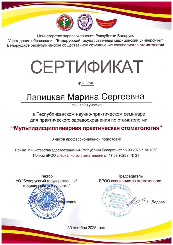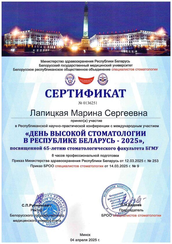 Владеет современными методами диагностики, лечения и профилактики стоматологических заболеваний. Регулярно посещает научно-практические конференции и мастер-классы. Повышает свой профессиональный уровень на курсах тематического усовершенствования БелМАПО. При работе с пациентами использует индивидуальный подход.