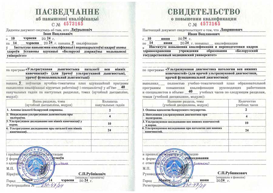 - 2024, Повышение квалификации в БГМУ по программе «Ультразвуковая диагностика патологии вен нижних конечностей»