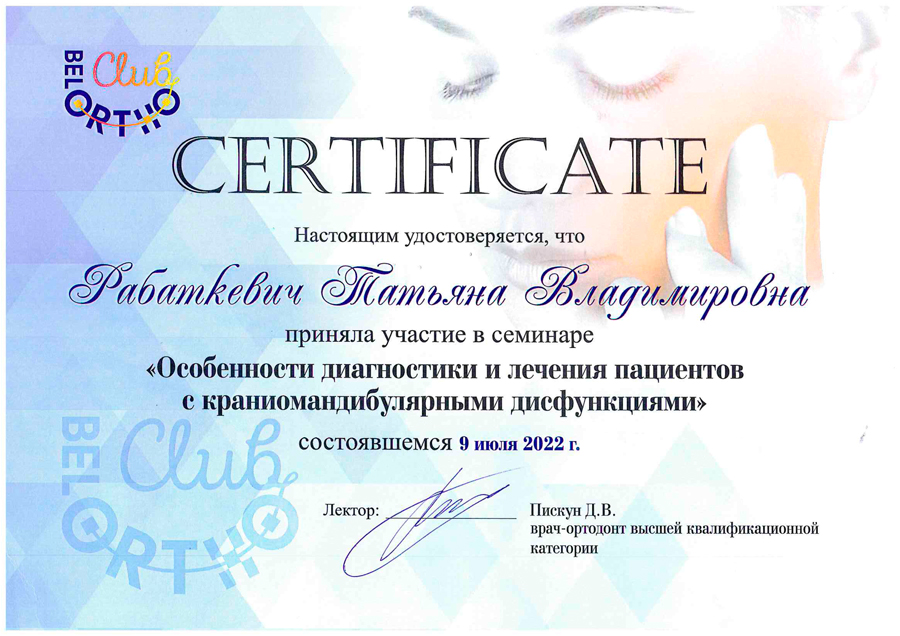- 2022, «Особенности диагностики и лечения пациентов с краниомандибулярными дисфункциями»