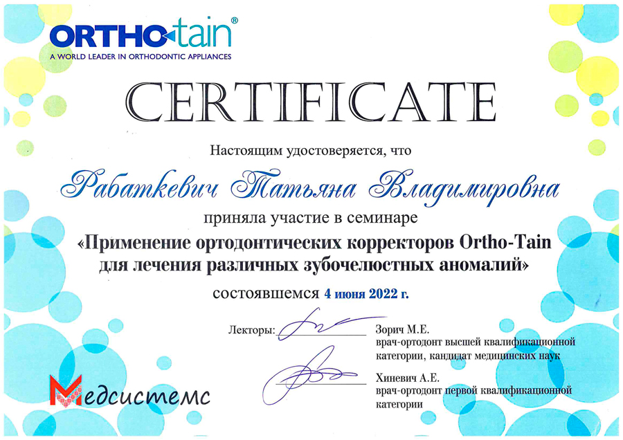 - 2022, «Применение ортодонтических корректоров Ortho-Tain для лечения различных зубочелюстных аномалий» Зорич М.Е., Хиневич А.Е.,2022