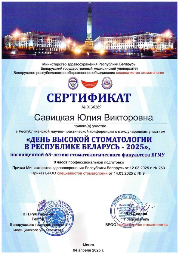 Савицкая Юлия Викторовна окончила стоматологический факультет Белорусского государственного медицинского университета в 2013 году.