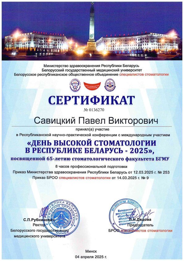 • 2016, БелМАПО по программе «Клинические и теоретические аспекты системы дентальных имплантатов с механизмом двойной стабильности»