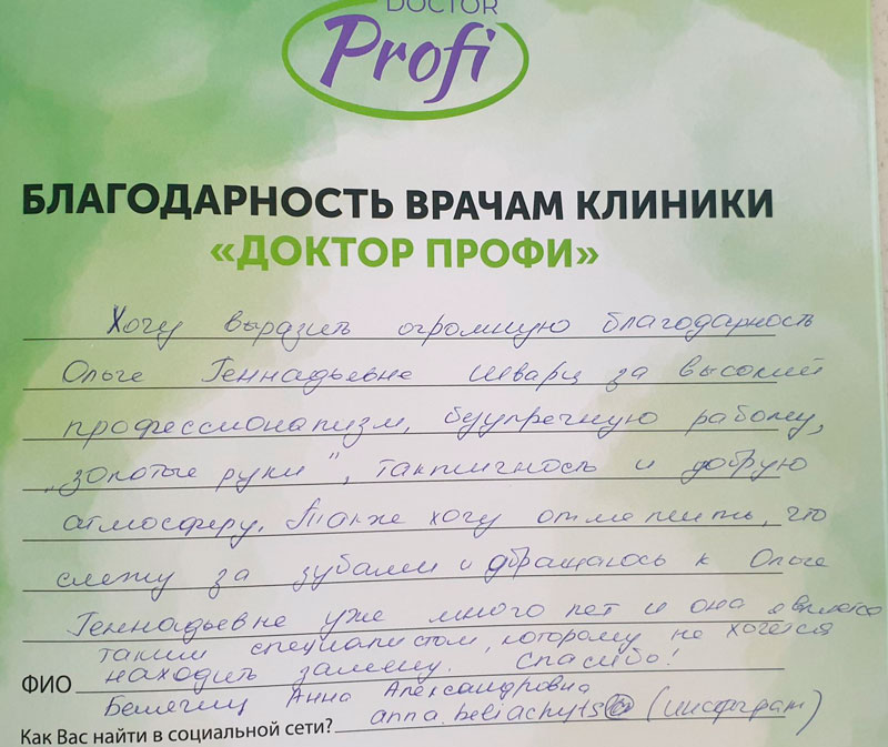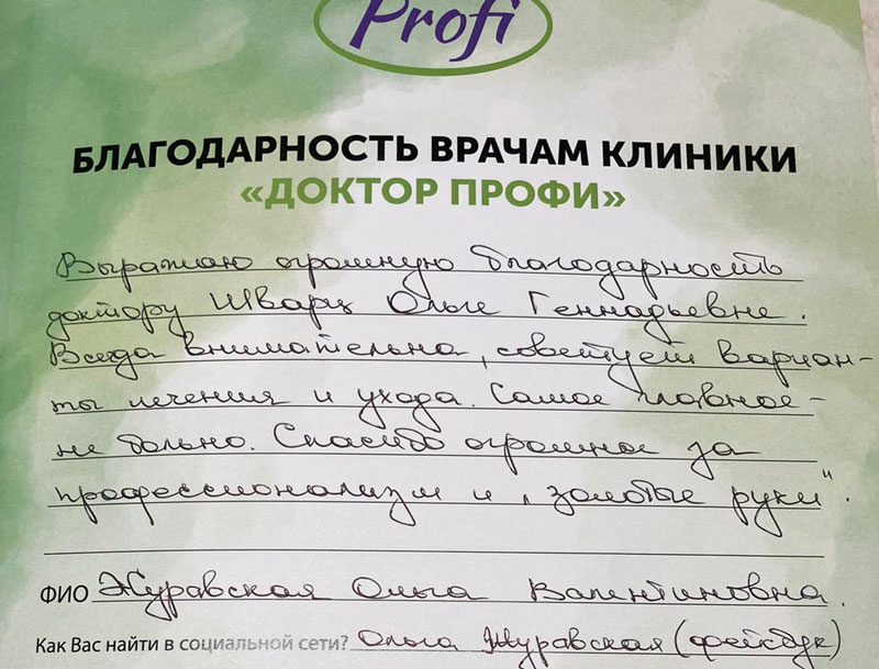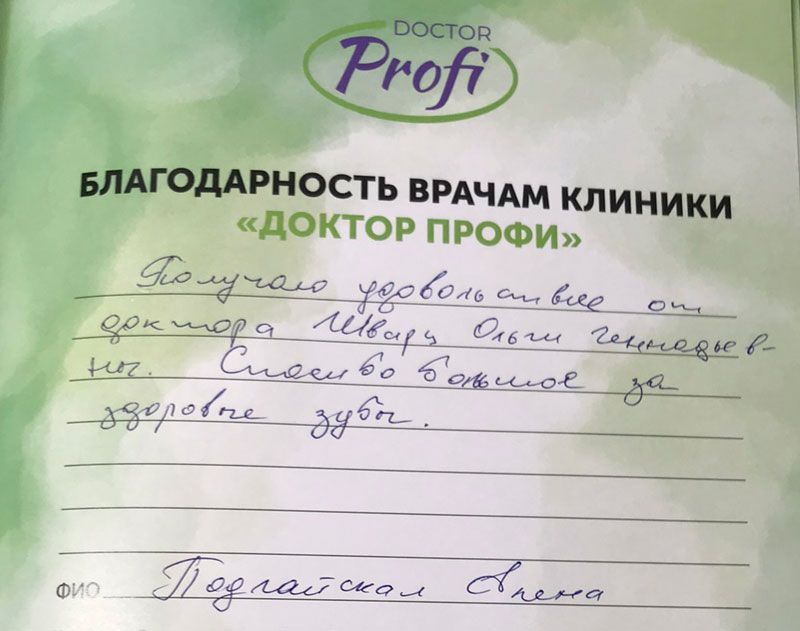 "Стоматология – моя жизнь. Не представляю себя на другом месте. Профессия приносит мне огромное моральное удовлетворение. Ведь каждый день мы помогаем нашим пациентам не только становиться здоровыми, но и дарим уверенность в себе, в своих силах. Я счастлива, когда пациентам нравится результат моей работы, и они уходят из кабинета с лучезарной улыбкой".