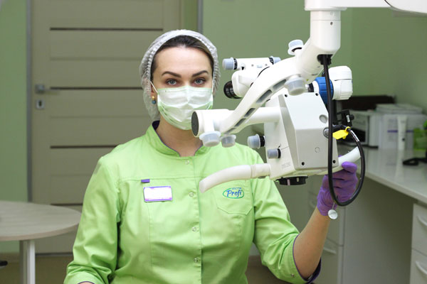 В медицинском центре «Доктор Профи» врачи-стоматологи проводят лечение зубов с помощью бинокулярных луп с бестеневым источником света.