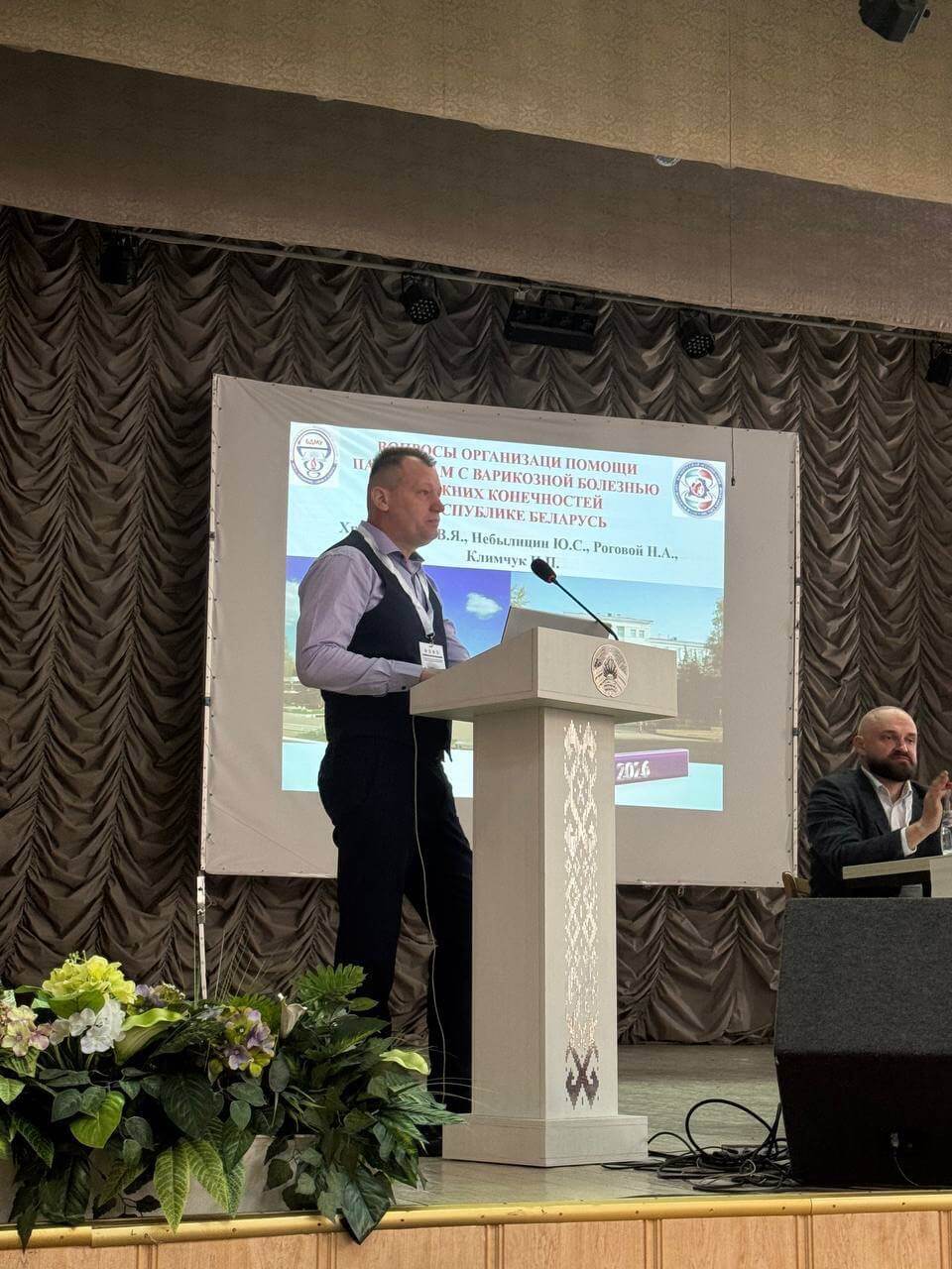 Медицинский центр «Доктор Профи» на мероприятии представлял врач-флеболог Небылицин Юрий Станиславович. Он выступил с докладом на тему: «Вопросы организации помощи пациентам с варикозной болезнью нижних конечностей в Республике Беларусь». .
