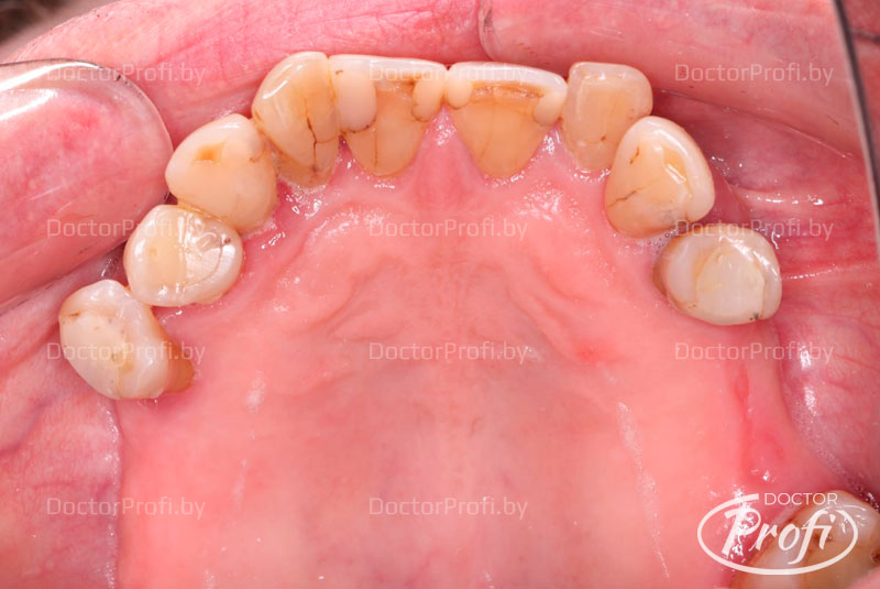 К нам обратился пациент 70 лет с жалобами на подвижность зубов верхней нижней челюсти, а также на периодически возникающие боли в этих зубах. Исходная ситуация была следующей. В полость рта определялись зубы, которые были подвижности первой и второй степени. Мосты были несостоятельны, то есть мостовидные протезы были изготовлены более 10 лет назад. Они были расколоты и также были подвижные опорные зубы.