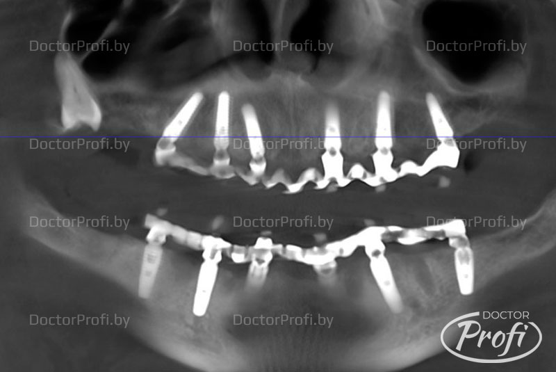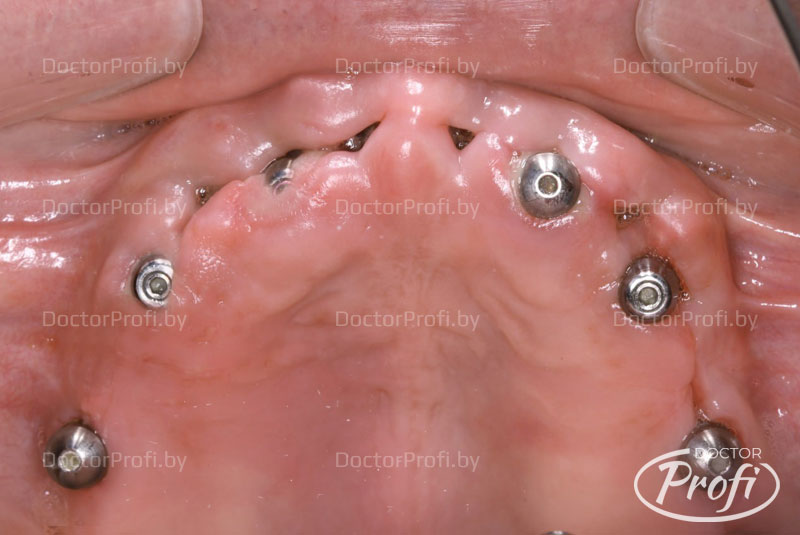 Установлено шесть имплантов на нижней челюсти и шесть имплантов на верхней челюсти.
