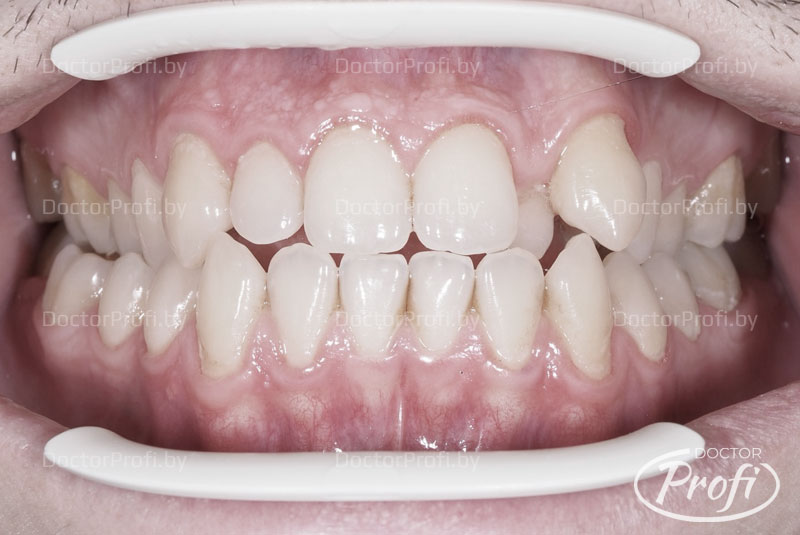 Пациент обратился в клинику c жалобами на сложность при жевании и эстетику улыбки из-за перекрёстнго прикуса и обратного перекрытия бокового резца.