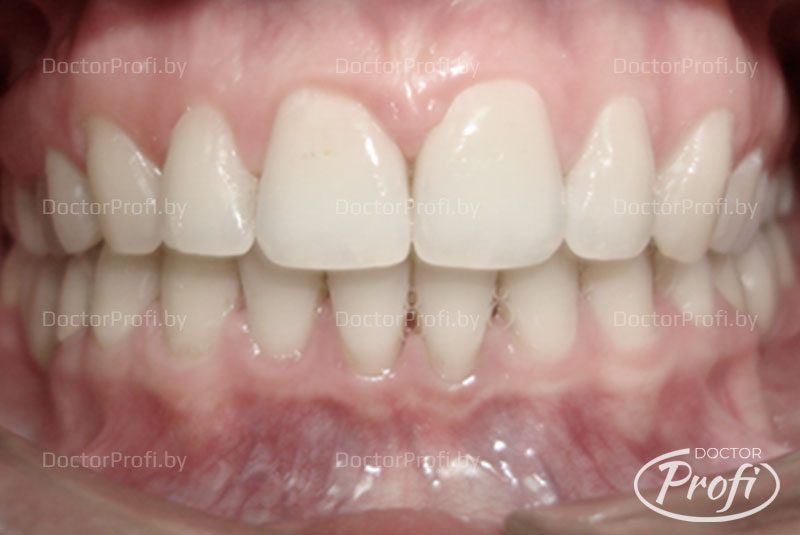 Клиническая ситуация пациентки – промежутки между зубами (диастемы, тремы), чрезмерный наклон зубов, дефекты зубного ряда. Если в данном случае провести только протезирование (ортопедическое лечение), то необходимо покрывать все зубы коронками. Пациентке мы предложили альтернативный малоинвазивный вариант комплексного лечения.